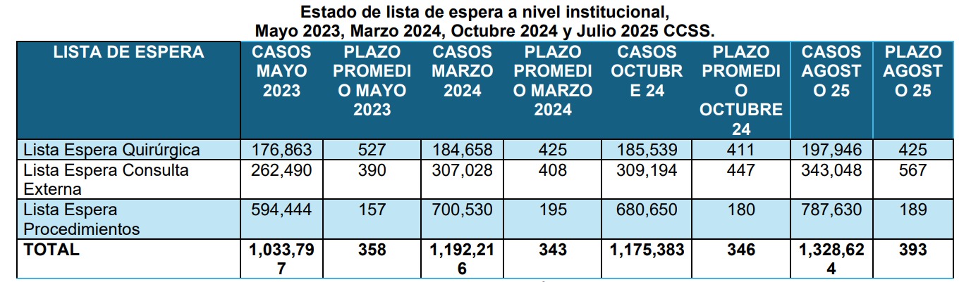 "Las tres listas (consulta externa, procedimientos y quirúrgica) presentan un aumento acumulado de aproximadamente un 12% (141.586 casos) entre mayo de 2023 y octubre de 2024, y un incremento del 28% (294.827 casos) entre mayo de 2023 y agosto de 2025. La cantidad de pacientes sigue in crescendo desde la implementación de la Hoja de Ruta", reveló la Auditoría.