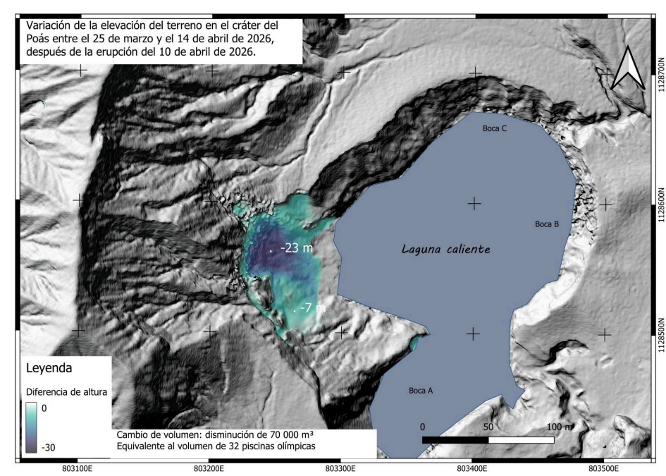 Según detalla el Ovsicori, en un recorrido que hicieron ayer martes lograron detectar que una consecuencia de esta erupción es que una pared en el borde Suroeste del lago perdió 23 metros de altura en el cráter.