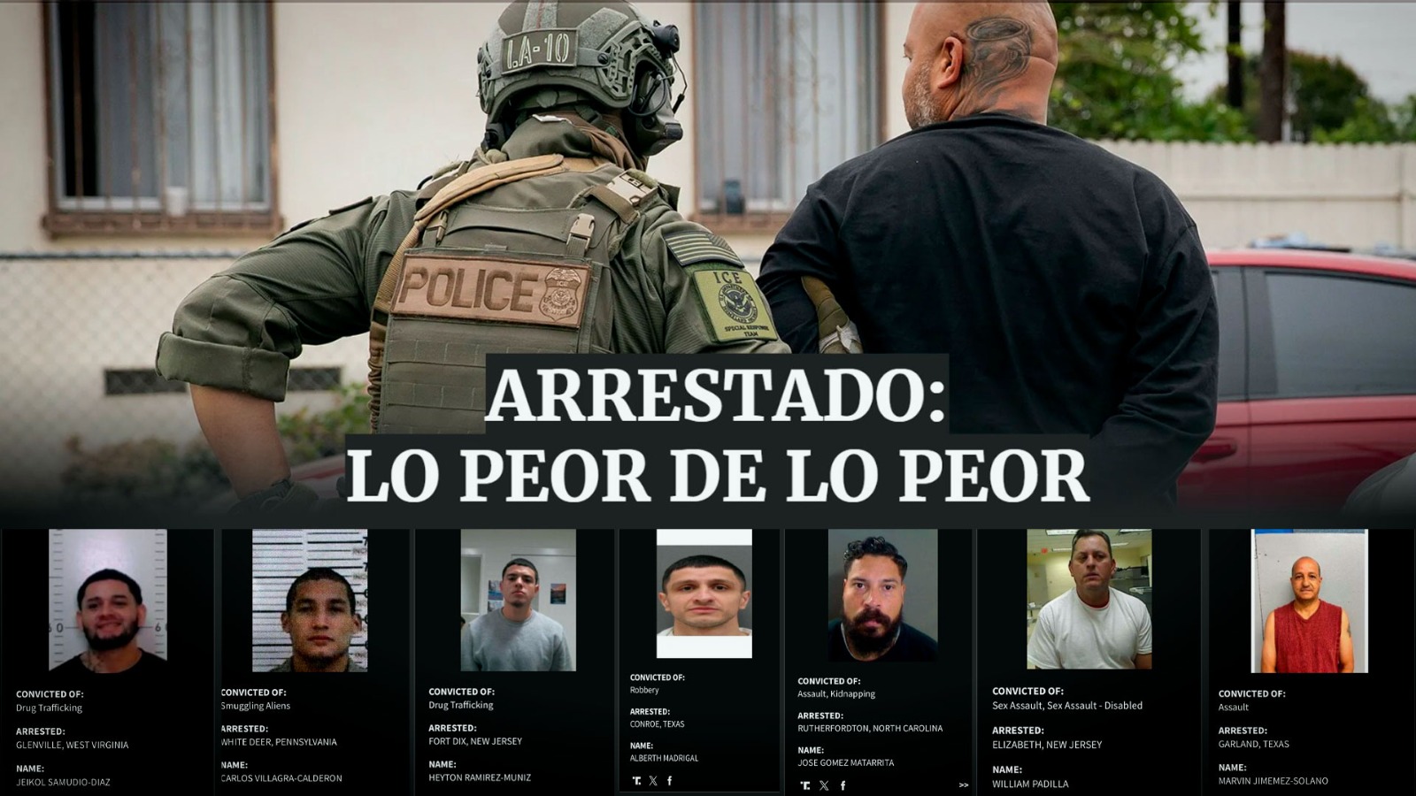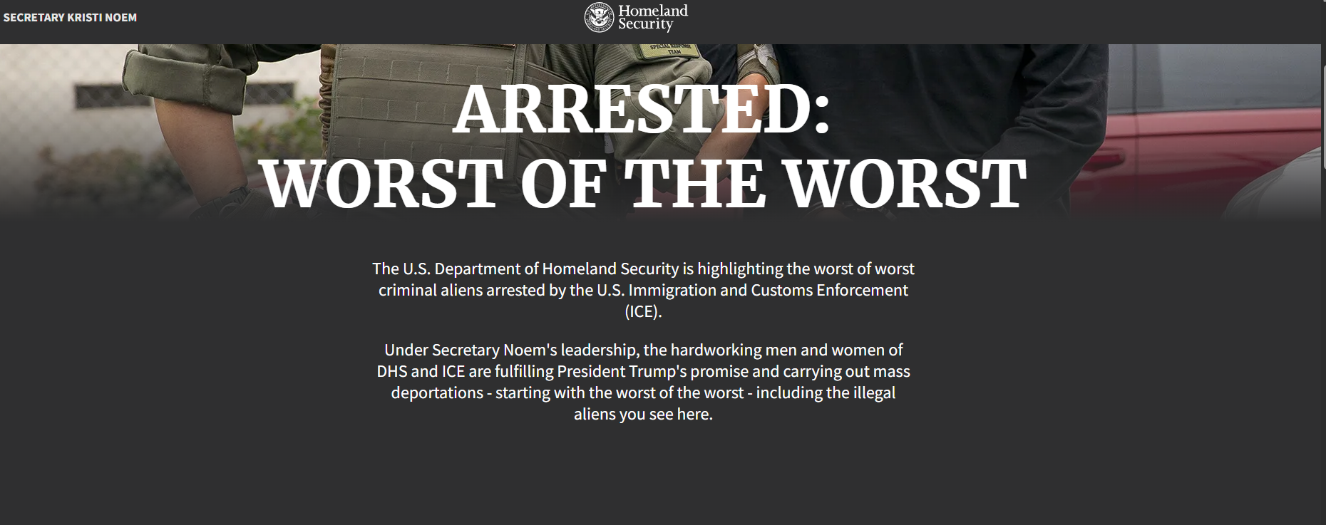 En la web del Departamento de Seguridad Nacional de Estados Unidos se indica que están destacando "a los peores criminales extranjeros arrestados por el Servicio de Inmigración y Control de Aduanas (ICE). Bajo el liderazgo de la Secretaria Noem, los hombres y mujeres trabajadores del DHS y del ICE están cumpliendo la promesa del Presidente Trump y llevando a cabo deportaciones masivas, comenzando con los peores de los peores, incluidos los inmigrantes ilegales que ven aquí".