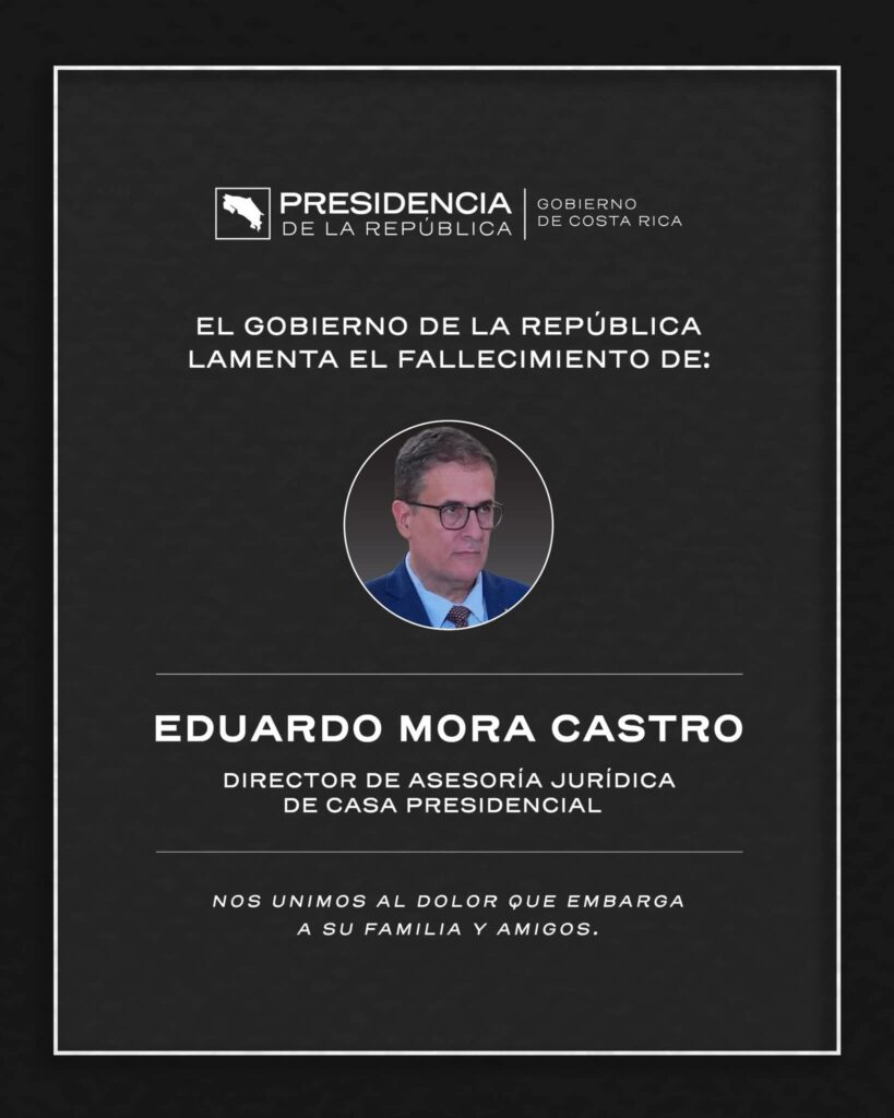 La Presidencia de la República confirmó este jueves el fallecimiento de Eduardo Mora Castro, asesor jurídico del presidente Rodrigo Chaves.