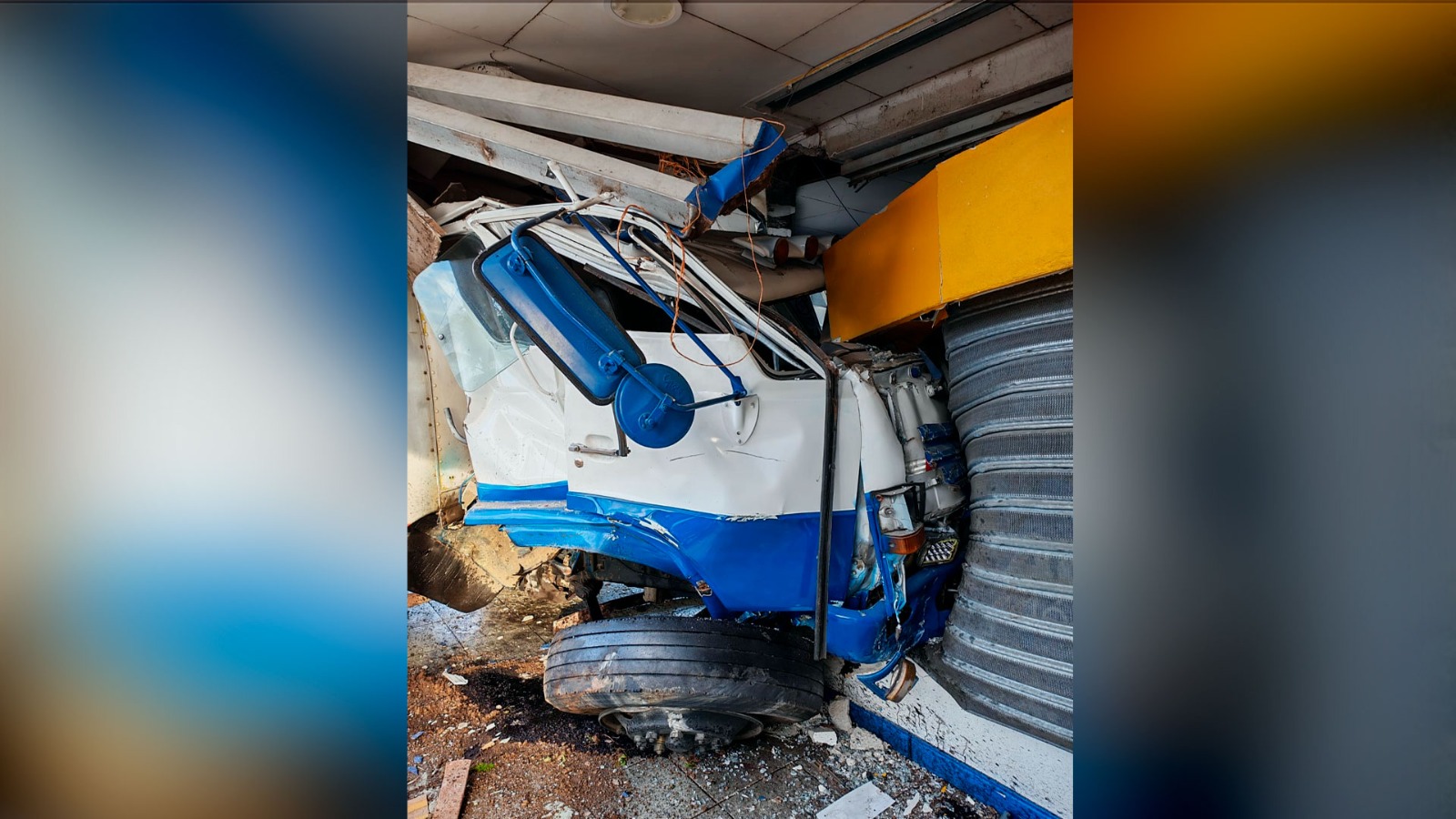 Según detalla, la colisión se dio frente a la gasolinera Parrita LSM y debido al impacto, como se puede ver en fotos que circulan en redes, el vehículo pesado se estrelló contra un local comercial.