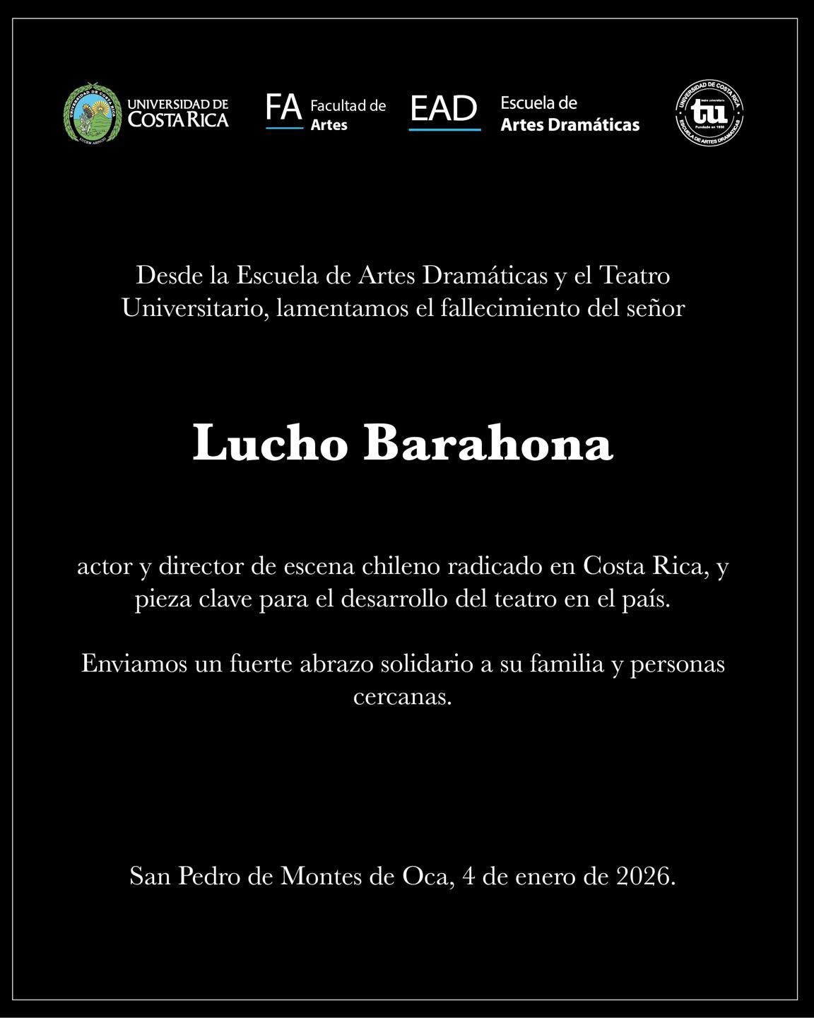 "Siempre recordaremos a Lucho Barahona por su enorme aporte al teatro costarricense. Como actor, director, gestor y productor, Lucho entregó su vida al teatro. Sin duda deja una imborrable huella en nuestro sector".