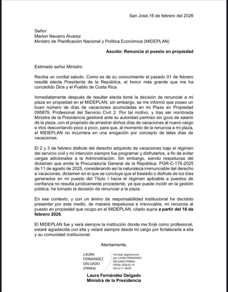 La presidenta electa y actual ministra de la Presidencia, Laura Fernández Delgado, presentó la renuncia irrevocable a la plaza en propiedad que ocupaba en el Ministerio de Planificación Nacional y Política Económica (Mideplan).