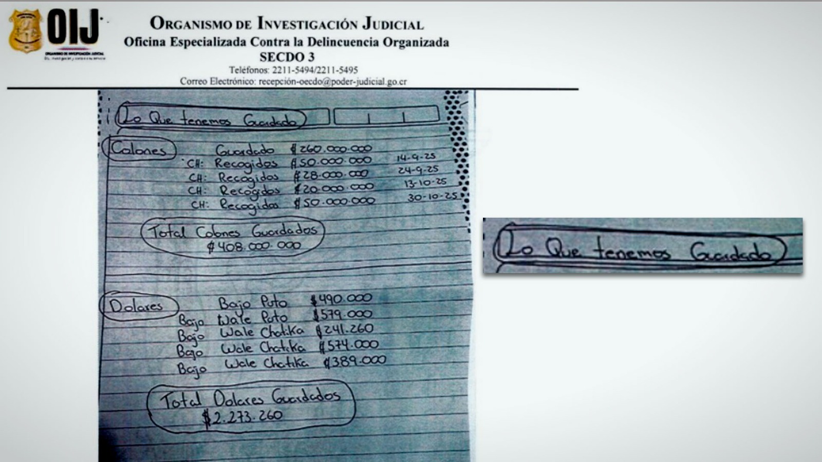 Acá se pueden observar los montos millonarios que la misma nota afirma y en pronombre de la primera persona del plural, es decir que ese "tenemos" abarca a la propia Anita, pues se incluye en ese botín de dinero. Sumando ¢408.000.000 (cuatrocientos ocho millones de colones) y otro exorbitante monto de $2.273.260 (dos millones doscientos sesenta y tres mil, doscientos sesenta dólares). Dichas cifras de dinero son coincidentes con la capacidad económica del grupo criminal, resultando que en una casa de seguridad ubicada en el Condominio Condado Baviera se logró decomisar más de 160 millones de colones en efectivo, dice el documento.
