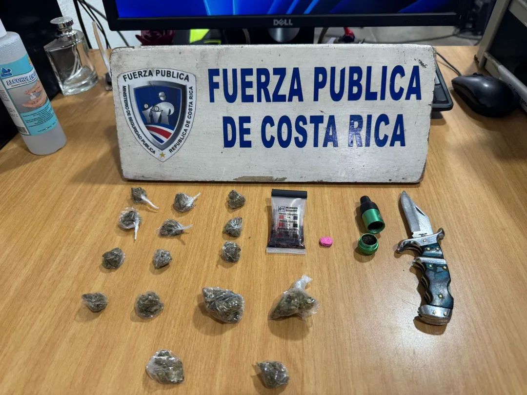 De acuerdo con el reporte policial, en total se ubicaron 16 dosis de marihuana, una pipa con residuos de esta droga, un arma blanca tipo cuchilla y una pastilla rosada que, tras una prueba de campo, dio positivo para MDMA, conocida como éxtasis.