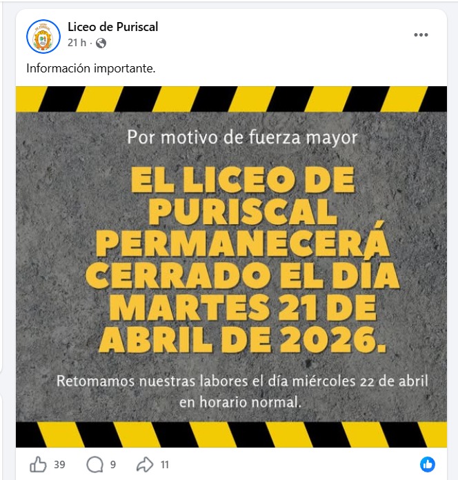 En el caso de Puriscal, la suspensión se aplicó en el Liceo de Puriscal y en el Colegio Técnico Profesional de Puriscal. Al conocer las amenazas, activaron sus protocolos de seguridad y, como medida preventiva, suspendieron las lecciones.