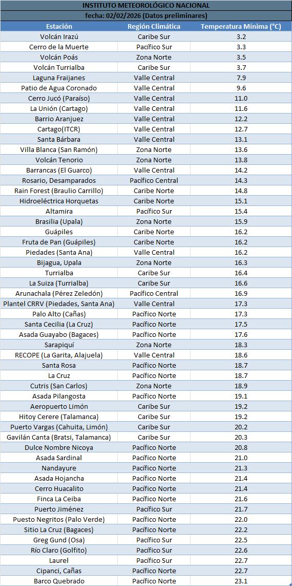 Tal como se puede observar en la tabla publicada por el IMN en Facebook, esta baja temperatura se dio en la estación ubicada en el Volcán Irazú.