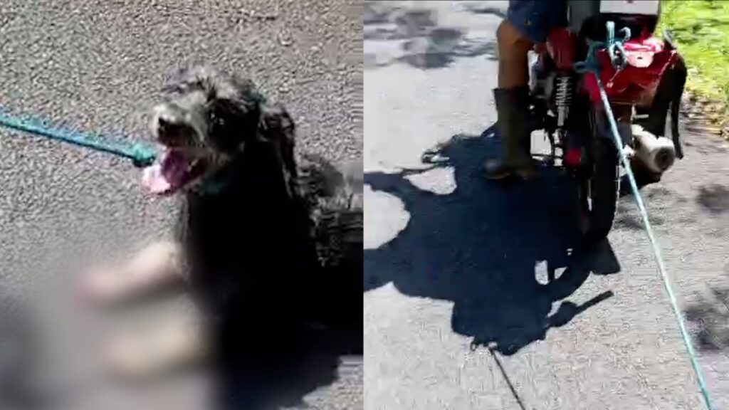 Tal como se puede observar, el perro va amarrado del cuello a la parte trasera de la motocicleta que conducía un hombre adulto.