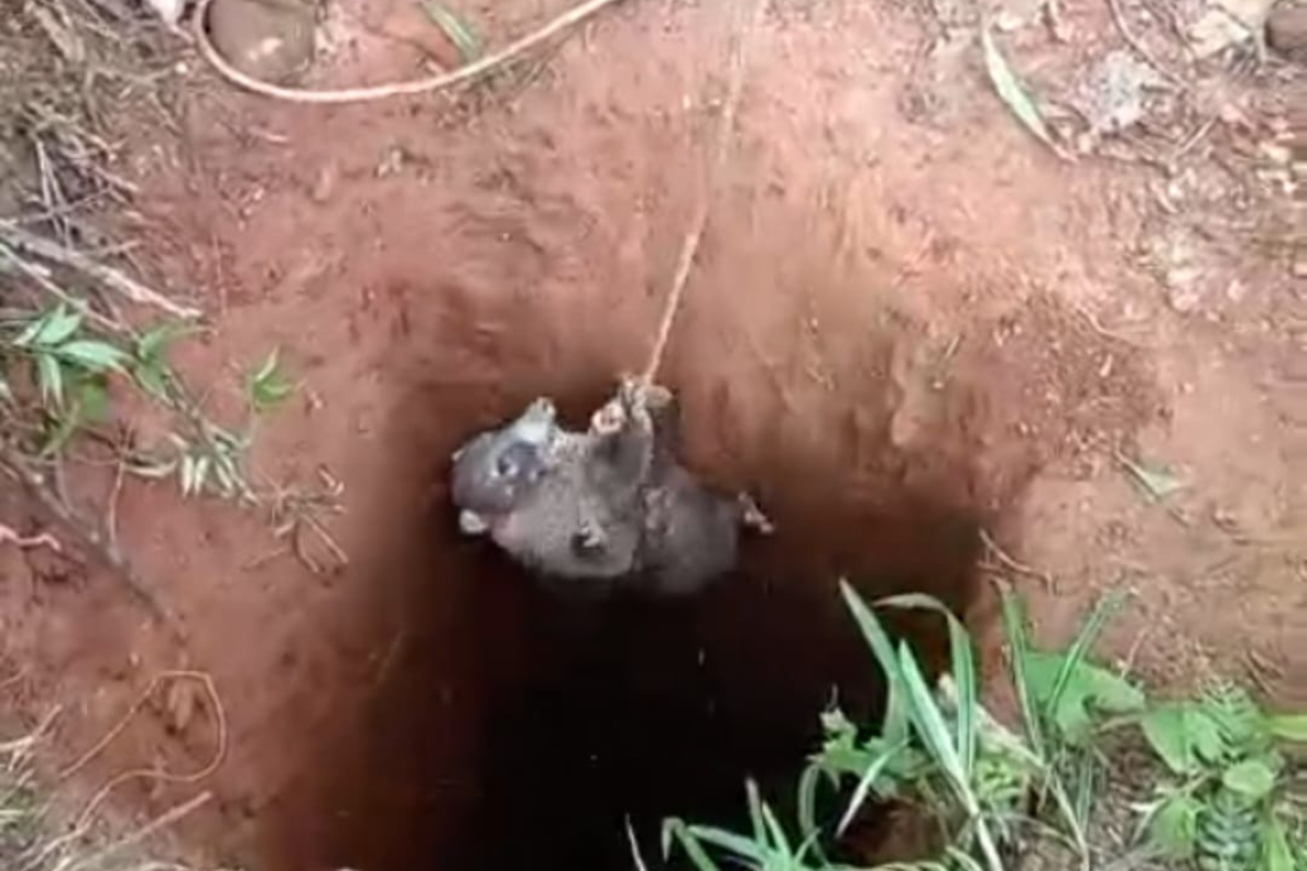(Video) Policía rescata a pequeño pizote que cayó en fosa de minería ilegal en Crucitas