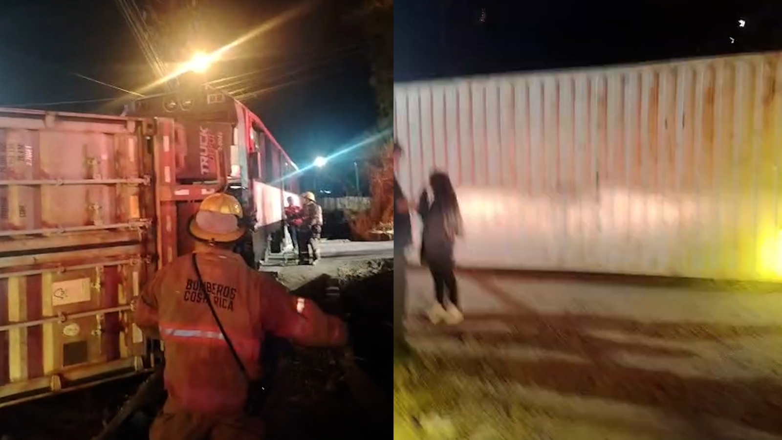 Este martes a eso de las 6:43 p.m. el Cuerpo de Bomberos recibió la información de que se había presentado una colisión entre un tráiler y el tren en Cinco Esquinas de Tibás, situación que terminó dejando la parte del contenedor volcado en la carretera.