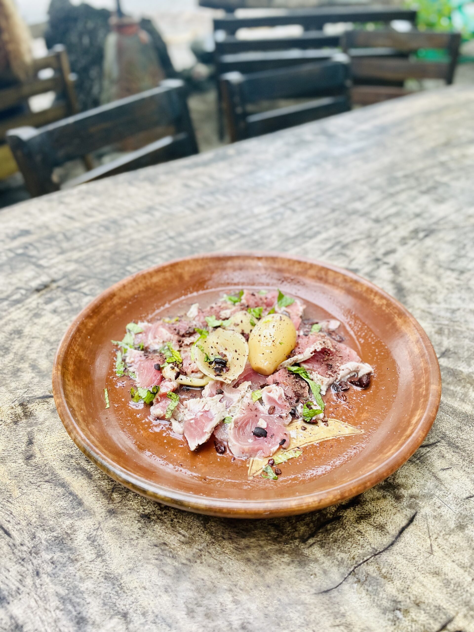 Carpaccio de atún: Finas lonjas de atún local combinadas con especies y trozos de cacao que le aportan textura y complejidad al plato