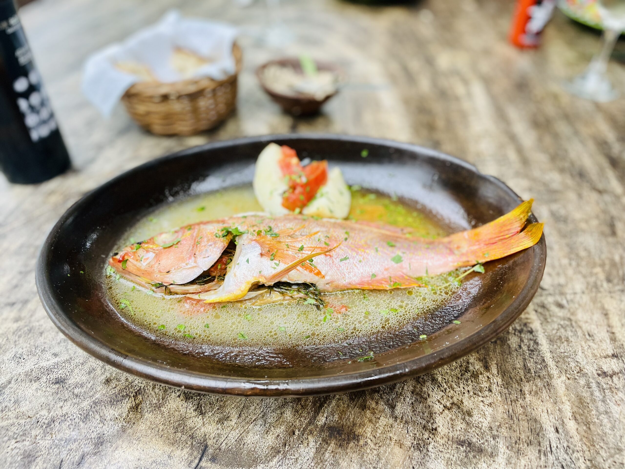 Pargo al vapor: Preparado con una combinación de especies y un fondo de caldo, este plato nuevamente define en su maxima expresión los sabores delicados que el mar nos trae y también la impecable técnica en que se elabora.