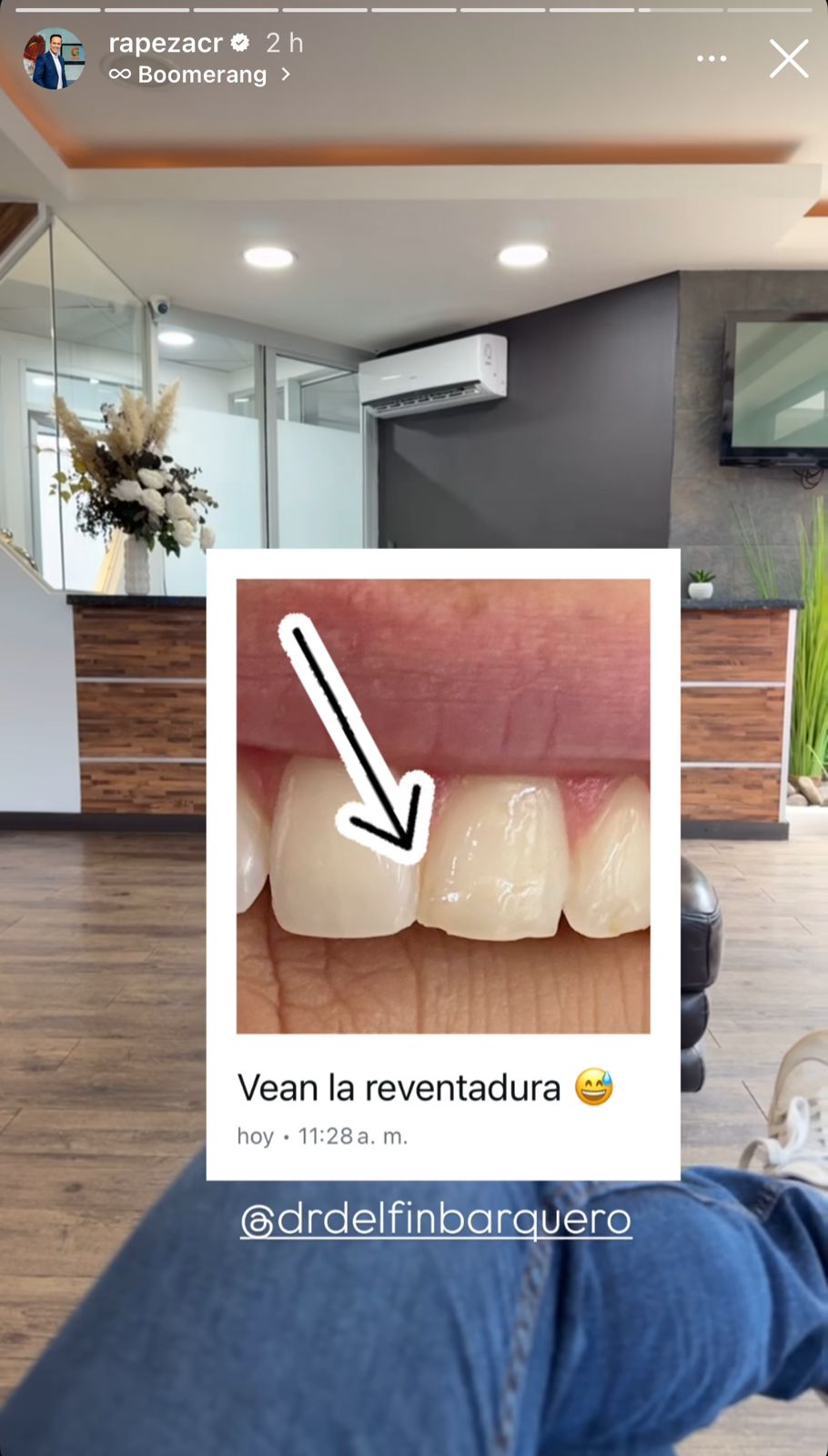 Pérez compartió una fotografía en la que mostró la parte del diente afectada y cómo quedó tras el incidente. Además, publicó el momento en el que su odontólogo le brindaba la atención correspondiente.