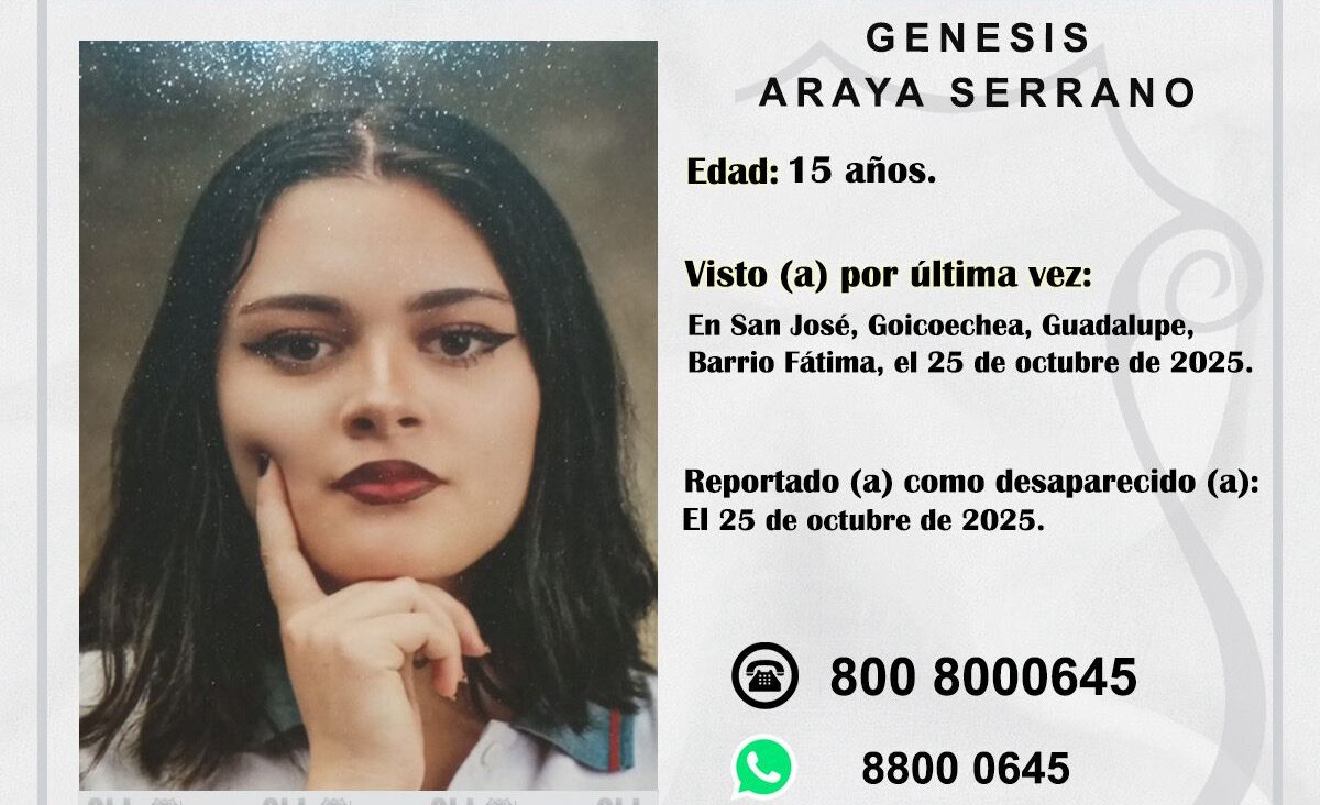Según confirmó la policía judicial, se trata de Génesis Araya Serrano, de 15 años, quien fue reportada como desaparecida el 25 de octubre de 2025.