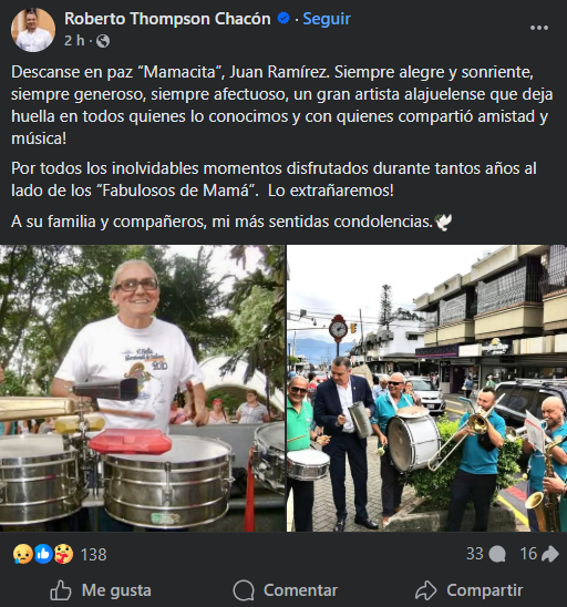 La noticia fue dada a conocer por el alcalde de Alajuela, Roberto Thompson, quien compartió fotografías del músico mientras se encontraba en sus labores y las acompañó con un sentido mensaje, destacando sus cualidades: