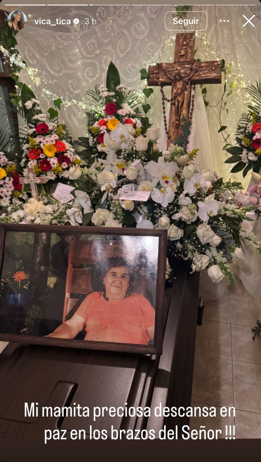 A través de sus redes sociales, Vica compartió algunas fotografías en sus historias, donde se observó el ataúd de su madre con una imagen de ella y unas flores, acompañadas del mensaje: "Mi mamita preciosa descansa en paz en los brazos del Señor", destacó la actriz.