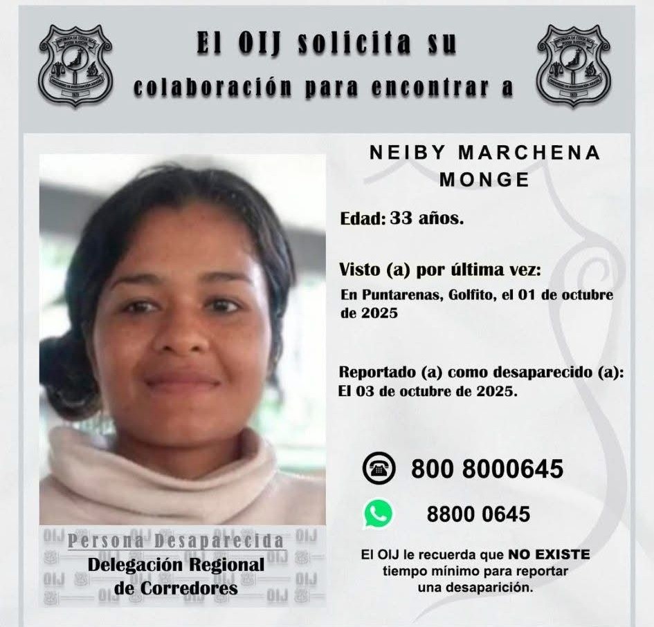 Neiby Marchena, de 33 años, desapareció el primero de octubre en Golfito. Se presume que ingresó desorientada montaña adentro en una finca ubicada en el kilómetro 20.
