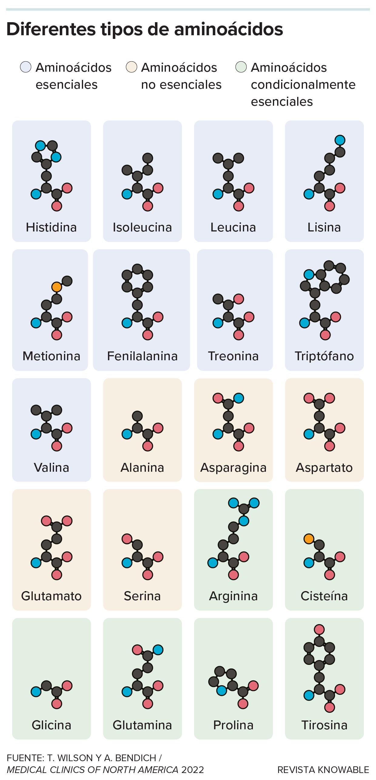 Incluso cuando no están creciendo activamente, todos los animales necesitan proteínas constantemente. Nuestros cuerpos pierden proteínas constantemente o descomponen las viejas y dañadas. Deben ser reemplazadas. Para ello, nuestras células necesitan aminoácidos, moléculas orgánicas que consisten en un fragmento que contiene nitrógeno unido a una molécula con carbonos. De los 20 aminoácidos diferentes que necesitamos, nuestras células pueden sintetizar 11; todo lo que necesitan es una fuente de carbono como el azúcar o la grasa, y nitrógeno, que podemos obtener de prácticamente cualquier tipo de proteína que ingerimos.