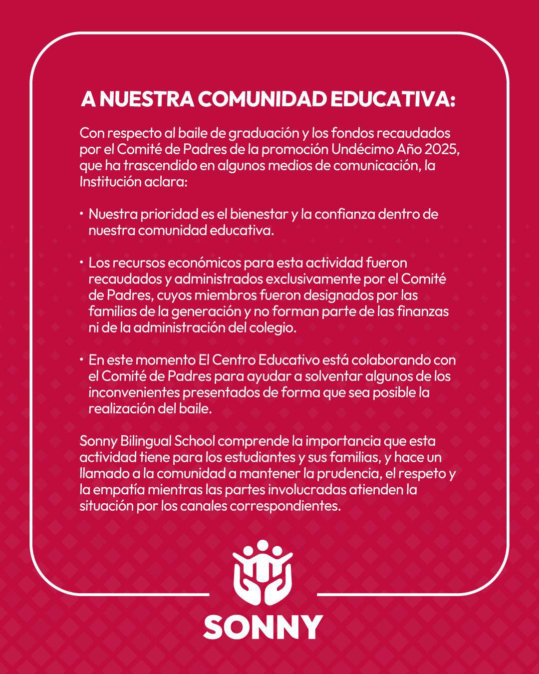 Sonny Bilingual School comprende la importancia que esta actividad tiene para los estudiantes y sus familias, y hace un llamado a la comunidad a mantener la prudencia, el respeto y la empatía mientras las partes involucradas atienden la situación por los canales correspondientes".