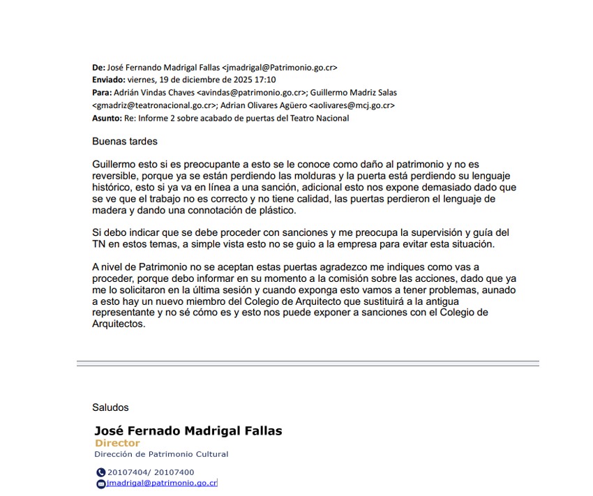 Un correo electrónico enviado el 19 de diciembre del año pasado por el director de Patrimonio Cultural José Fernando Madrigal al director del Teatro Nacional Guillermo Madriz revela que conocían de los daños ocasionados al edificio histórico y que tenían preocupación por las posibles sanciones.