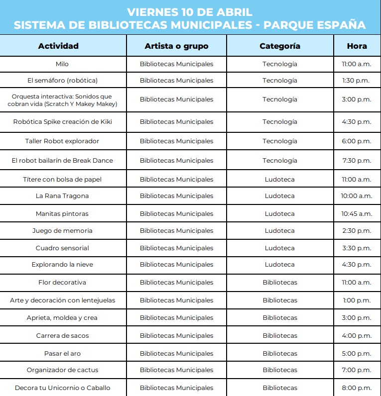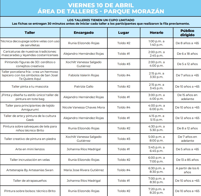 El Parque Morazán contará con un área de talleres, los cuales tienen cupo limitado, por lo que se recomienda llegar al menos 30 minutos antes del inicio de cada uno. Las actividades en esta sección arrancan desde la 1:00 p. m. y se extenderán hasta las 7:00 p. m., ofreciendo espacios para pintar, dibujar y llevar la imaginación a otro nivel.