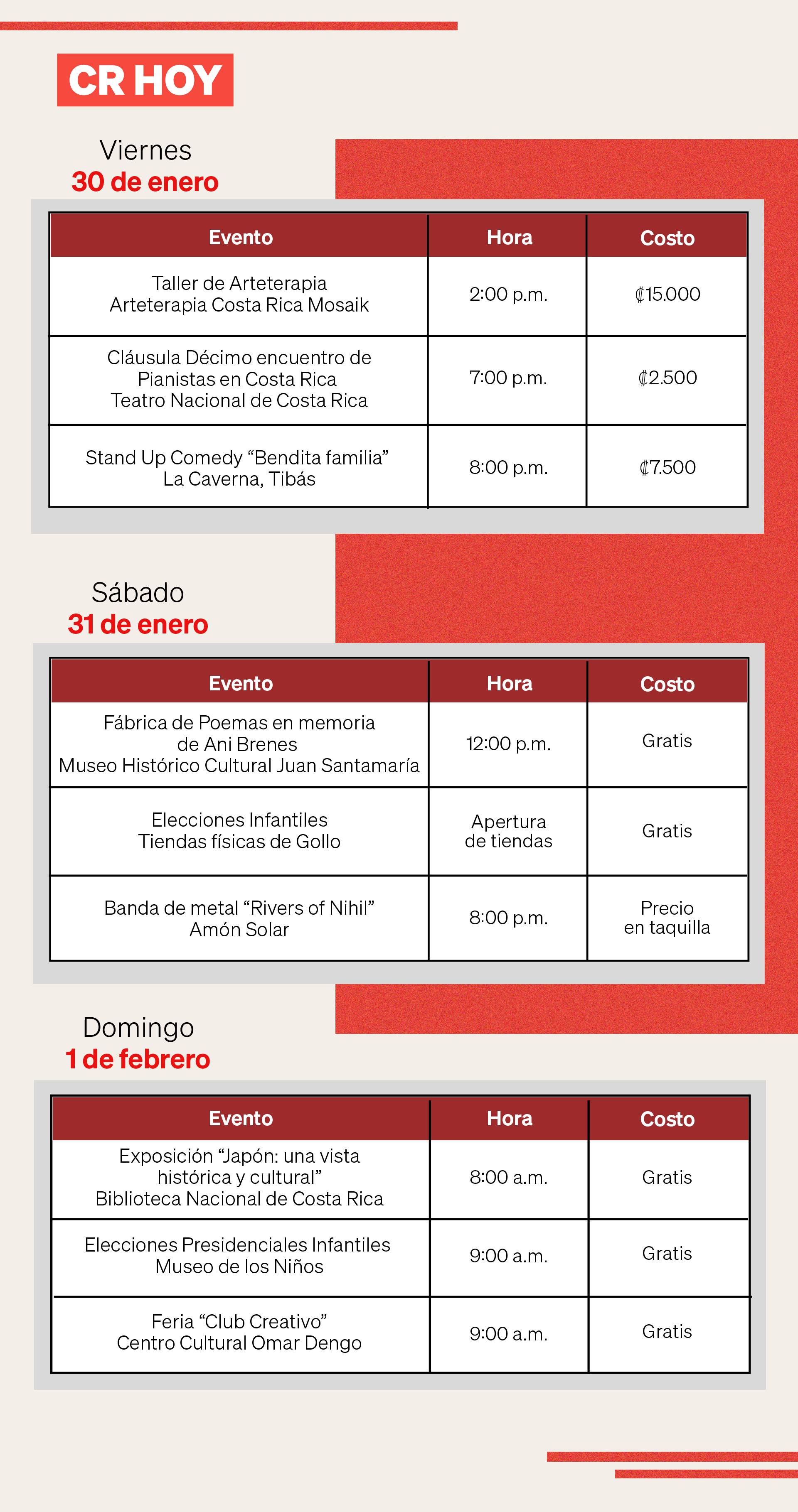 El 1.º de febrero se convertirá en el día más importante del fin de semana. Así que, luego de ejercer el derecho al voto, usted podrá disfrutar junto a su familia de las actividades que ofrece el país. El Club Creativo celebrará la democracia, la comunidad y el amor con una feria que incluirá actividades y emprendimientos en el Centro Cultural Omar Dengo, desde las 11:00 a. m. y hasta las 6:00 p. m.