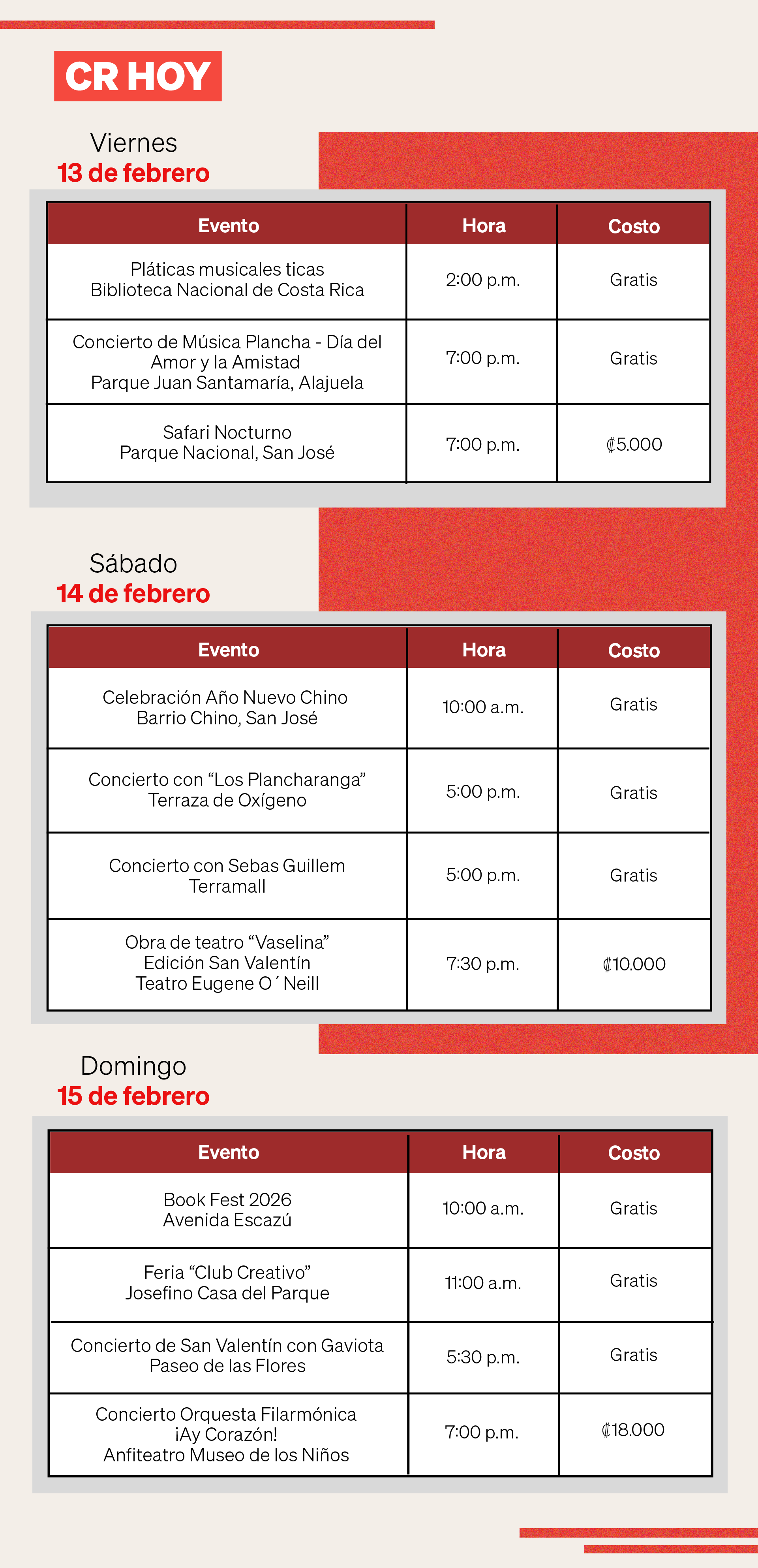Como cada semana, en CR Hoy planeamos una agenda cultural especial y, en esta ocasión, con aún más amor. Por eso, desde el viernes arrancamos con actividades para que el fin de semana comience a tomar ritmo.