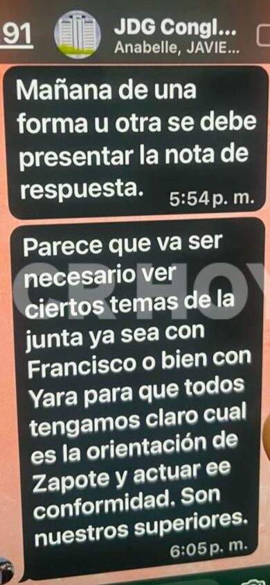 Antes de esa afirmación, había señalado: "Parece que va a ser necesario ver ciertos temas de la junta, ya sea con Francisco o bien con Yara, para que todos tengamos claro cuál es la orientación de Zapote y actuar de conformidad. Son nuestros superiores".