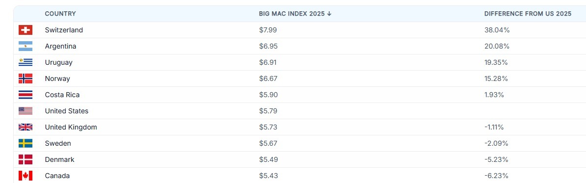 El país en el que es más costosa la Big Mac es en Suiza, con un precio de $7.99, es decir, casi ₡4.000 por la hamburguesa más emblemática de esta cadena de restaurantes.