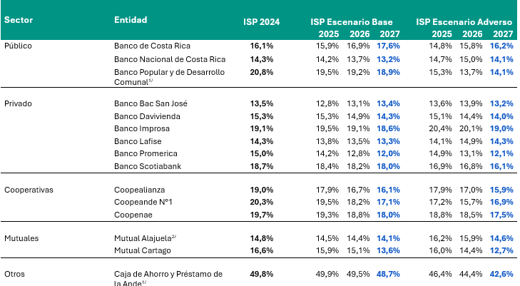 La Sugef determinó que, en el escenario base, todas las entidades participantes se mantienen, al cierre del período de proyección en 2027, con valores del indicador de suficiencia patrimonial superiores al mínimo regulatorio exigido por la Superintendencia: 10 %.