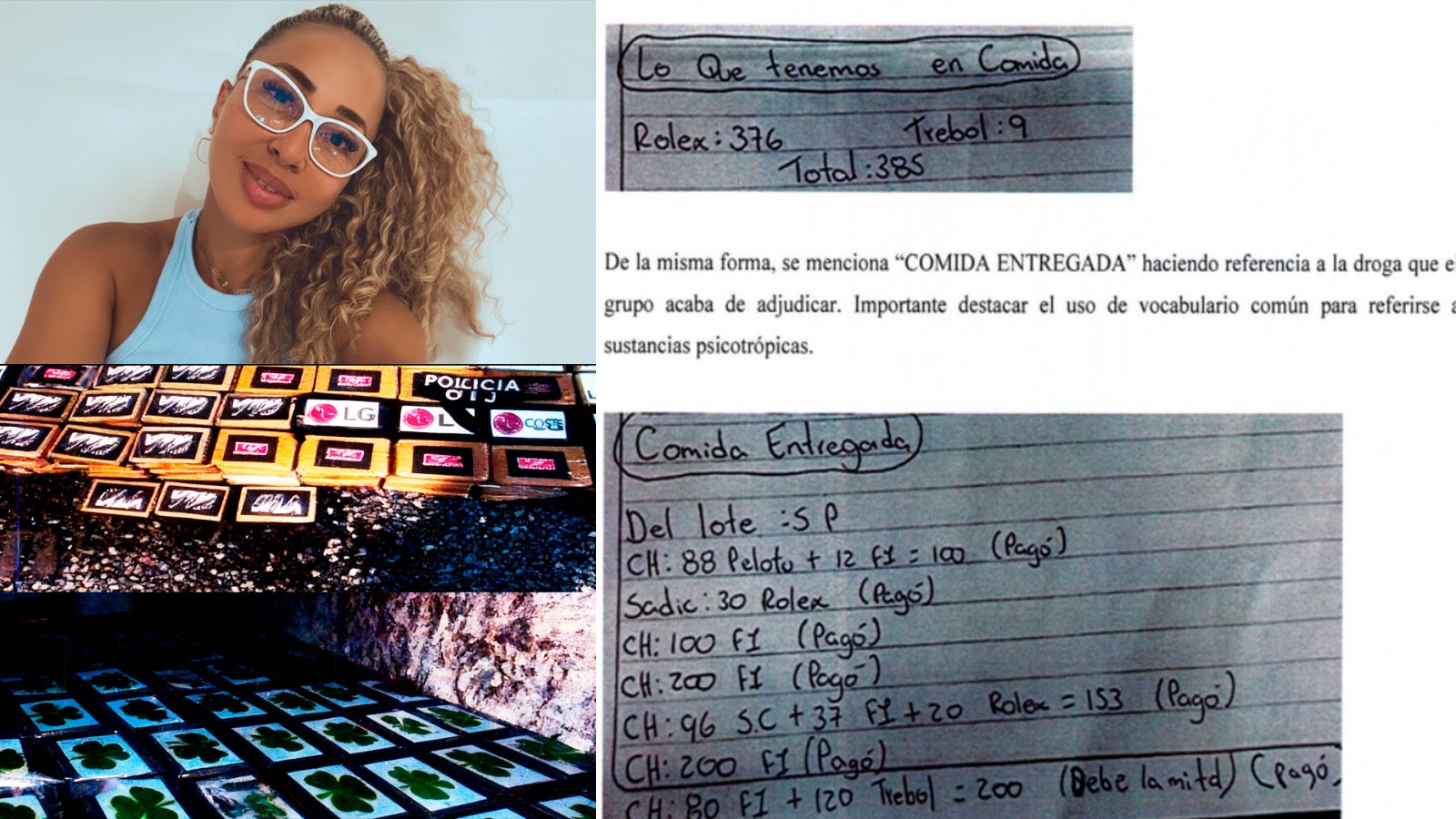 Por otra parte, se apreció la anotación de "LO QUE TENEMOS EN COMIDA" identificando ROLEX: 376 y TREBOL 09. Total 385. Siendo esto una evidente contabilidad de un cargamento de estupefacientes que el grupo criminal, mantiene aún en posesión. De la misma forma, se menciona "COMIDA ENTREGADA" haciendo referencia a la droga que el grupo acaba de adjudicar. Importante destacar el uso de vocabulario común para referirse a sustancias psicotrópicas.
