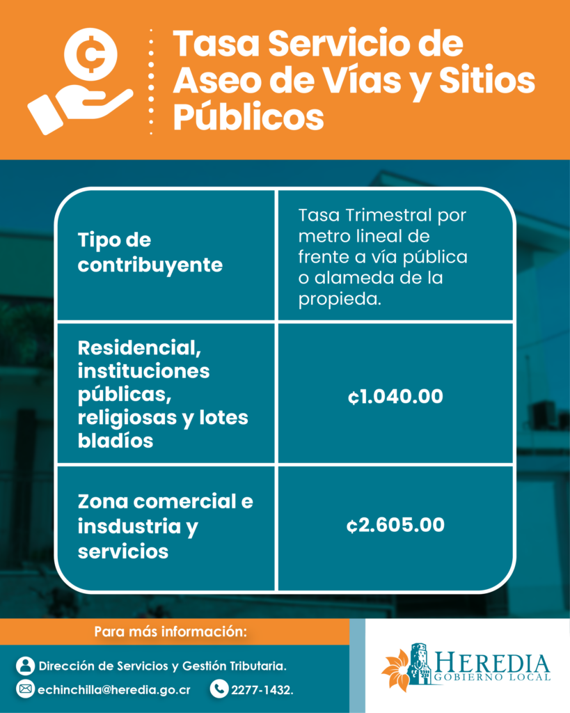 La Municipalidad de Heredia informó a los contribuyentes del cantón sobre las tarifas vigentes del servicio de aseo de vías y sitios públicos, así como las fechas de vencimiento establecidas para el pago de este tributo municipal.