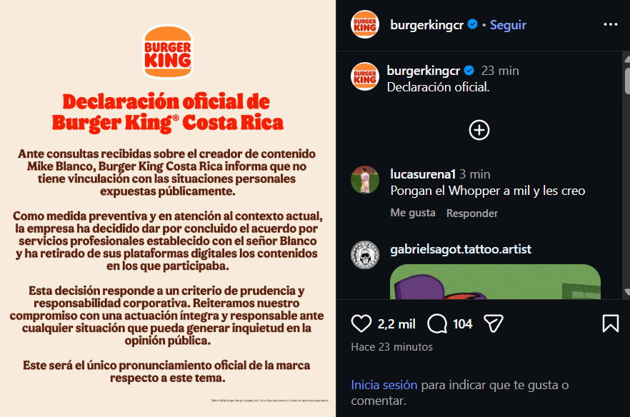 Ante consultas recibidas sobre el creador de contenido Mike Blanco, Burger King Costa Rica informa que no tiene vinculación con las situaciones personales expuestas públicamente, señalaron.