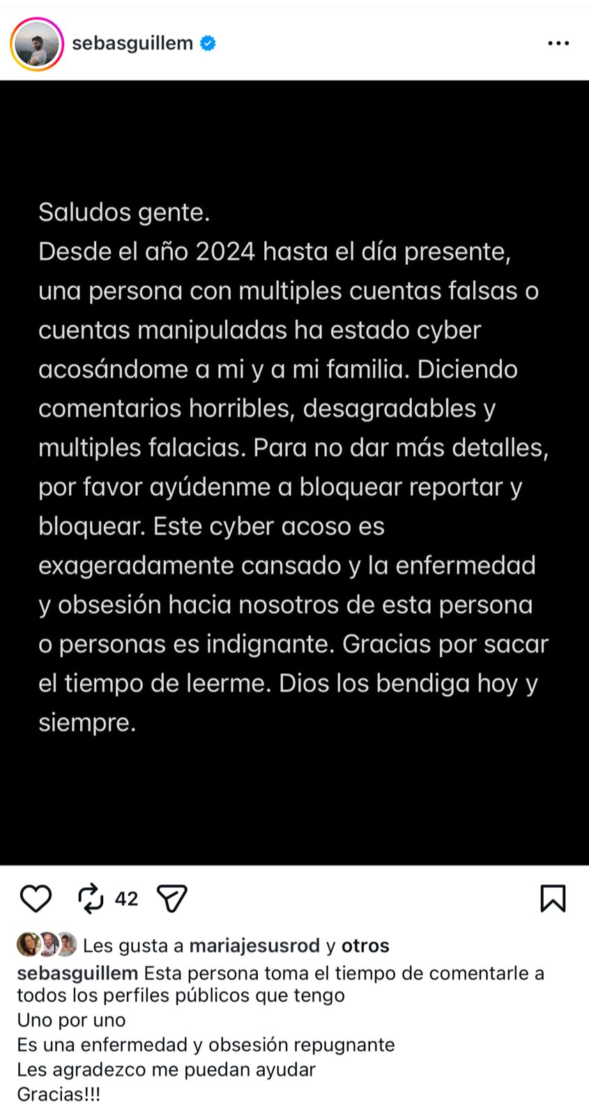 Saludos, gente. Desde el año 2024 hasta el día de hoy, una persona con múltiples cuentas falsas o cuentas manipuladas ha estado ciberacosándome a mí y a mi familia, comentó Guillén.