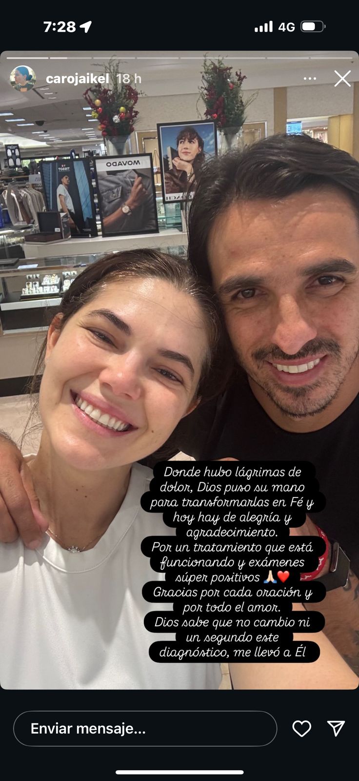 "Donde hubo lágrimas de dolor, Dios usó su mano para transformarlas en fe; y donde hoy hay alegría y agradecimiento…", escribió Jaikel al compartir la buena noticia. Además, señaló que su tratamiento está dando resultados positivos y que incluso algunos exámenes han mostrado avances favorables.