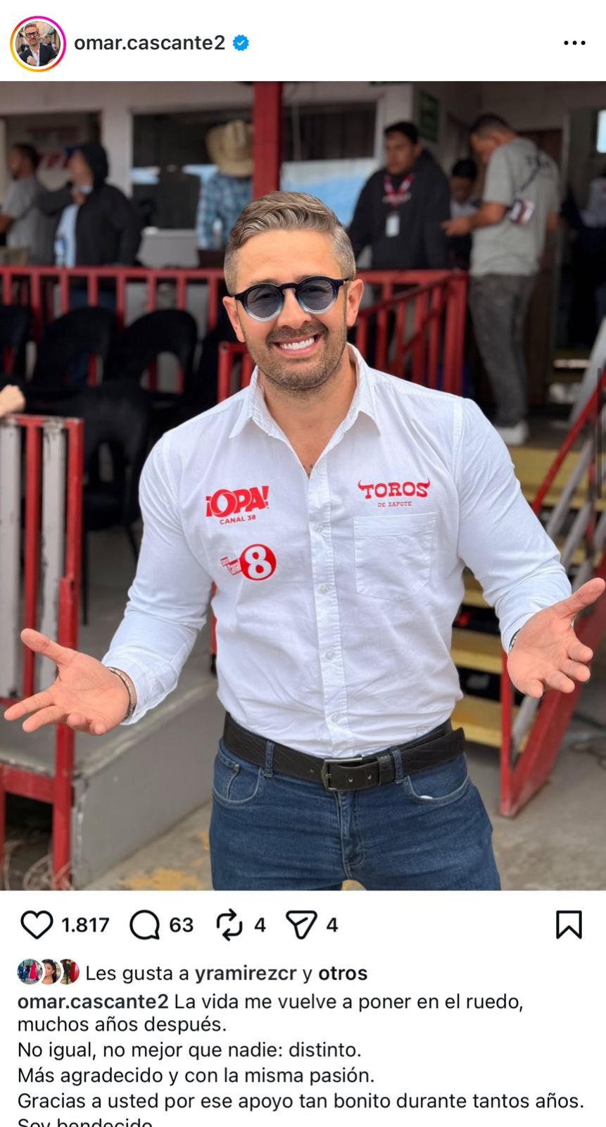 A través de sus redes sociales, Cascante compartió una fotografía con la camisa que utiliza para transmitir las corridas, la cual mencionó que la vida lo puso de nuevo en el ruedo, no para ser igual o mejor que nadie, sino para ser distinto.