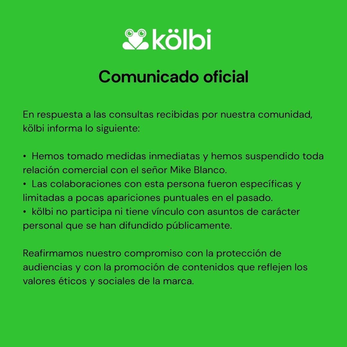 Por su parte, la marca Kölbi también realizó una publicación en la que indicó que, tras las consultas recibidas, tomó medidas inmediatas y suspendió toda relación comercial con Mike Blanco.
