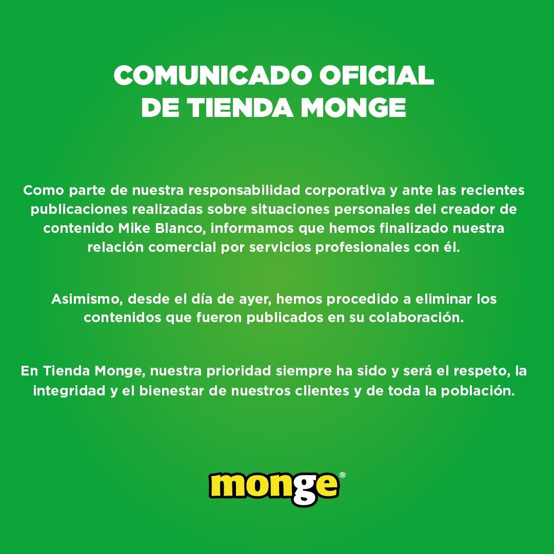 La marca de electrodomésticos Tiendas Monge emitió un comunicado en el que expresó que, como parte de su responsabilidad corporativa y ante las recientes publicaciones sobre las situaciones personales que rodean al creador de contenido Mike Blanco, debían informar que habían decidido finalizar la relación comercial que mantenían con él a través de servicios profesionales.