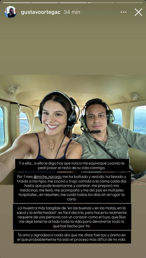 "Por 1 mes Miche Naranjo me ha bañado y vestido, ha llevado y traído a mis hijos, me cocinó y trajo comida a la cama cada día hasta que pude levantarme y caminar, me preparó mis medicinas, me llevó, me acompañó y me dio paz en múltiples hospitales… en resumen, me cuidó todos los días sin arrugar la cara. La muestra más tangible de ‘en las buenas y en las malas, en la salud y la enfermedad, es fácil decirlo, pero hacerlo realmente requiere de una persona con un corazón como el tuyo, que Dios me deje tenerte al lado toda la vida para devolverte todo lo que has hecho por mí".