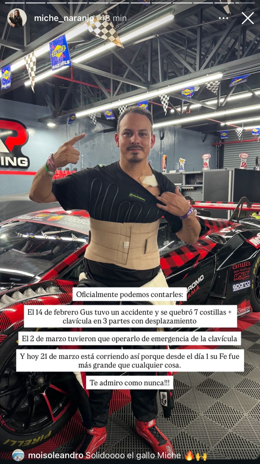 Su pareja, Michelle Naranjo, compartió en redes sociales una fotografía en la que se observa a Ortega con varios vendajes. Según detalló, el pasado 14 de febrero el piloto sufrió el accidente que le provocó la fractura de siete costillas y la clavícula en tres partes, además de un desplazamiento.