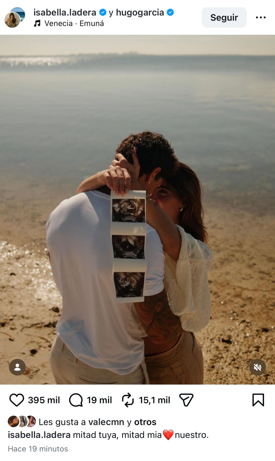 La noticia la dio a conocer a través de sus redes sociales, donde compartió una imagen junto a su actual pareja, Hugo García. En la fotografía, ambos aparecen abrazados en un lago mientras muestran una ecografía, confirmando así que esperan un bebé.