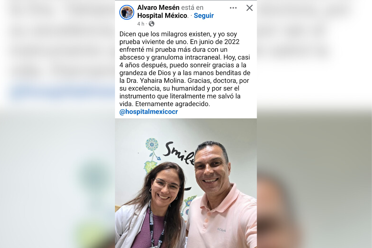 Gracias, doctora, por su excelencia, su humildad y por ser el instrumento que literalmente me salvó la vida. Eternamente agradecido, concluyó Mesén en su publicación.
