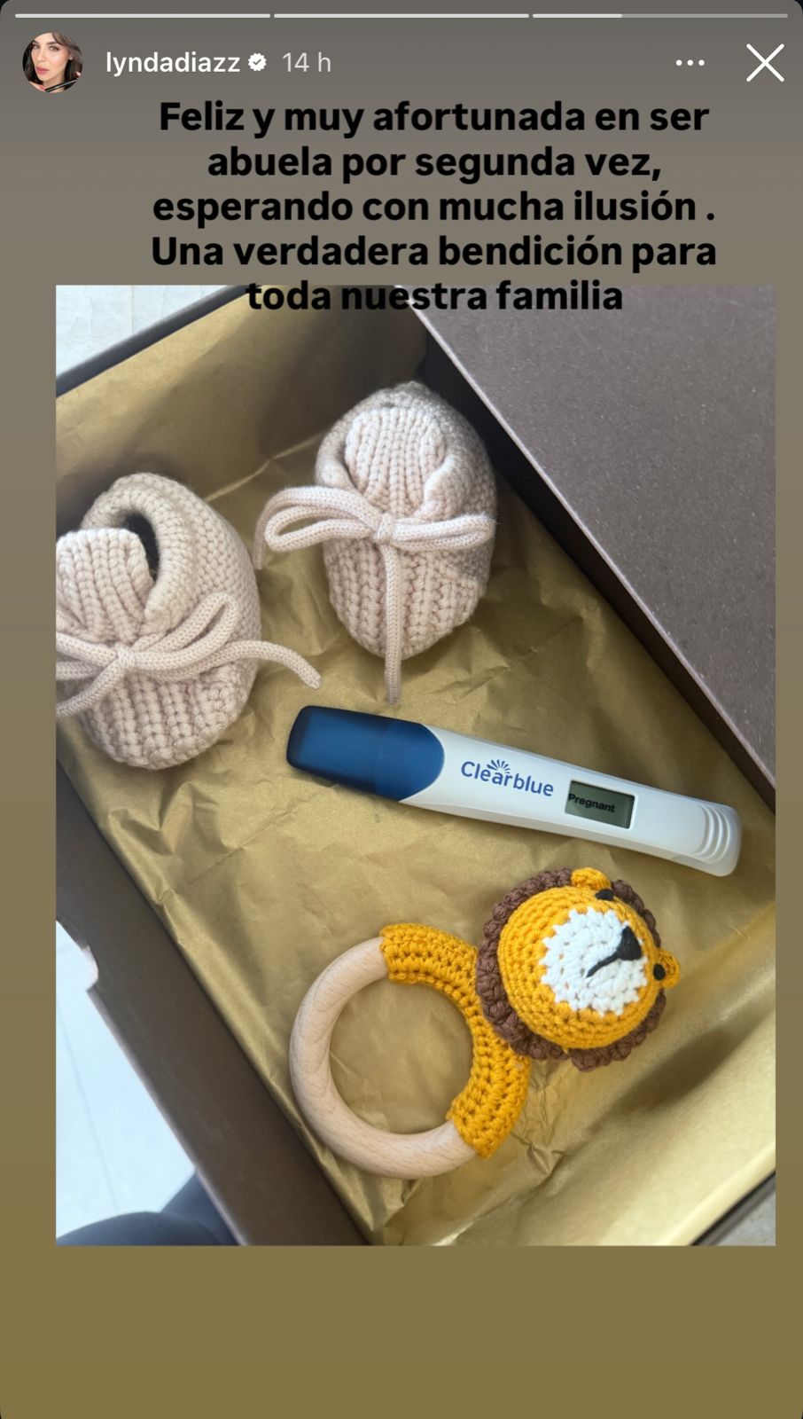Posteriormente, Díaz también compartió una imagen de la caja y destacó lo feliz y afortunada que se sentía por convertirse nuevamente en abuela. Además, expresó que espera con mucha ilusión la llegada del bebé, al que calificó como una verdadera bendición para su familia.