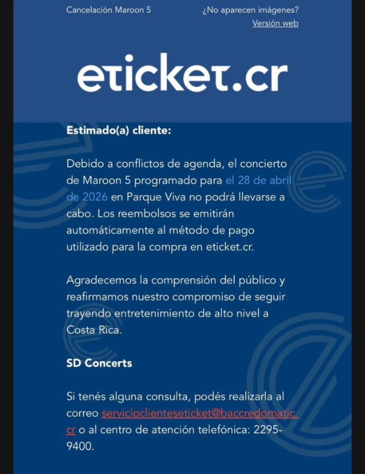 Maroon 5 canceló por segunda vez su concierto en Costa Rica, programado para el próximo 28 de abril. La tiquetera Eticket.cr confirmó la cancelación e indicó que quienes compraron entrada recibirán un reembolso automático.