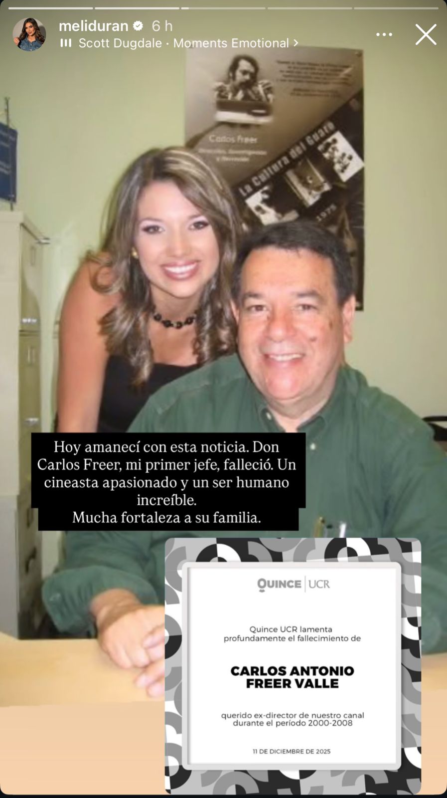 A través de sus redes sociales, Durán compartió una fotografía en la que aparece junto a Freer, ambos sonriendo, en una imagen que aparenta ser de hace varios años. La comunicadora también difundió la nota luctuosa publicada por la Universidad de Costa Rica (UCR) y acompañó la publicación con un mensaje en el que expresó el dolor que siente por la noticia.