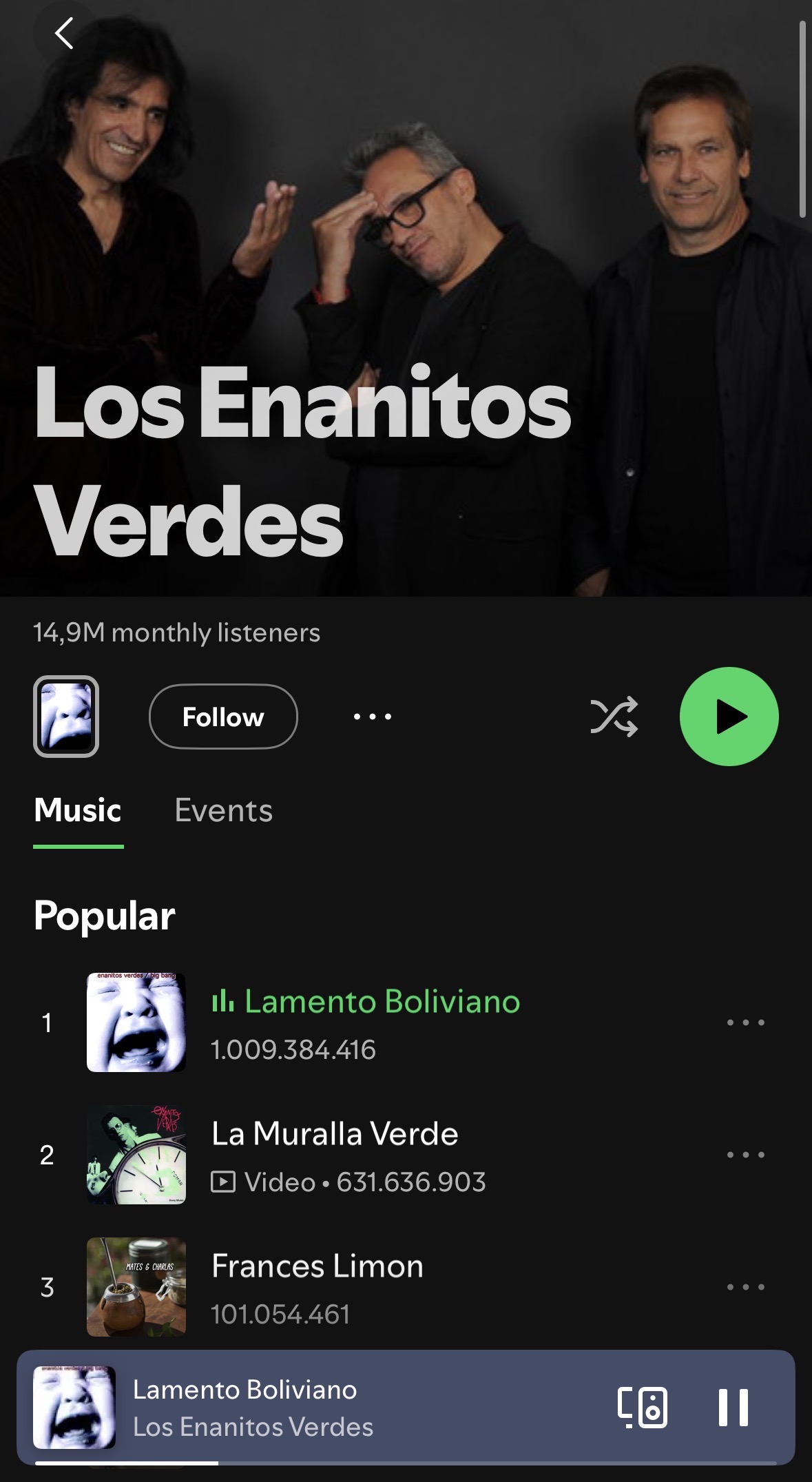 Con más de 14,9 millones de oyentes mensuales, Enanitos Verdes alcanzó a finales de marzo las 1.000 millones de reproducciones en Spotify con su éxito Lamento boliviano, ingresando al exclusivo "Billions Club", un reconocimiento al que solo acceden pocos artistas a nivel mundial, junto a nombres como Queen, Nirvana o Guns N' Roses, lo que refleja el impacto global de la banda argentina.