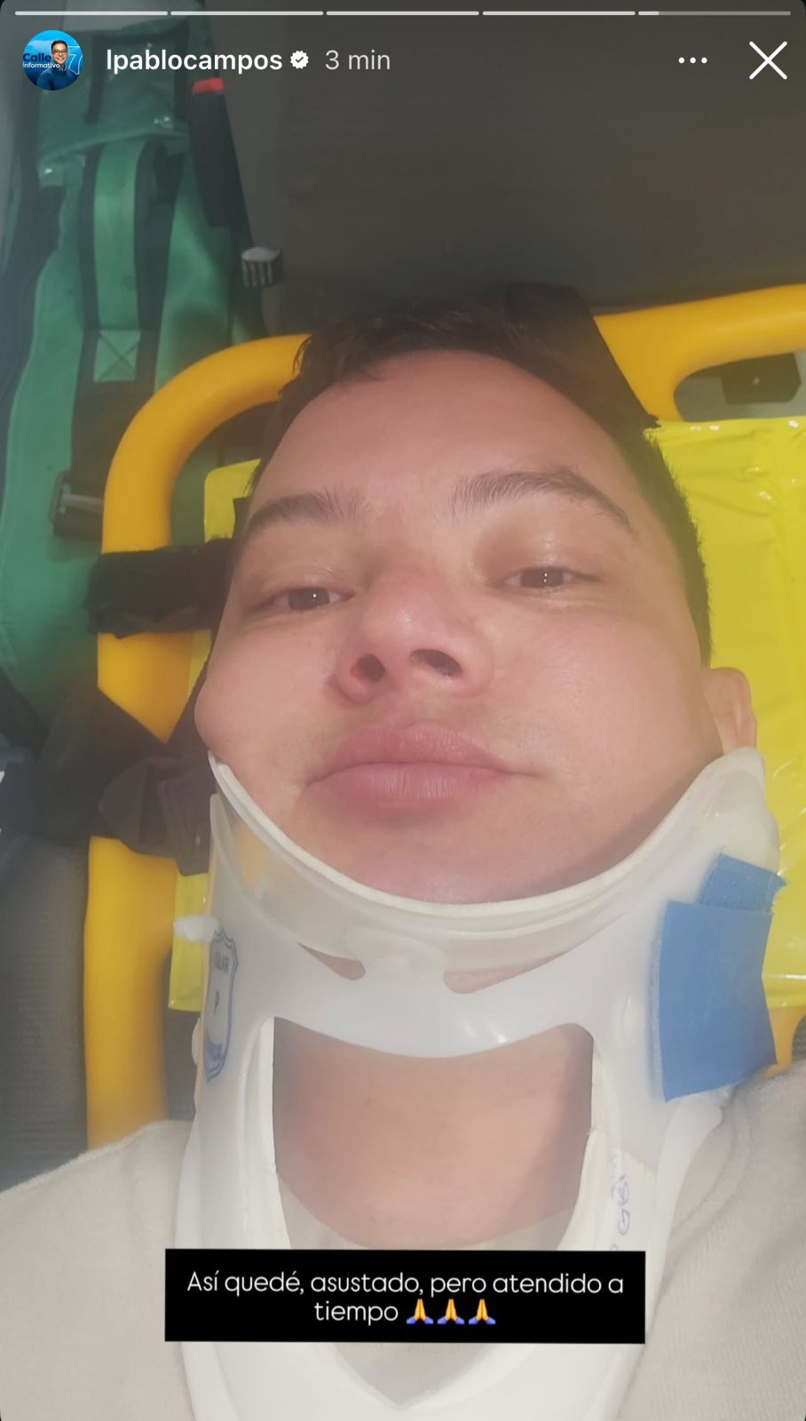 En una publicación posterior, se le observa con un collarín, recostado en una camilla, y escribió: "Así quedé, asustado, pero atendido a tiempo".