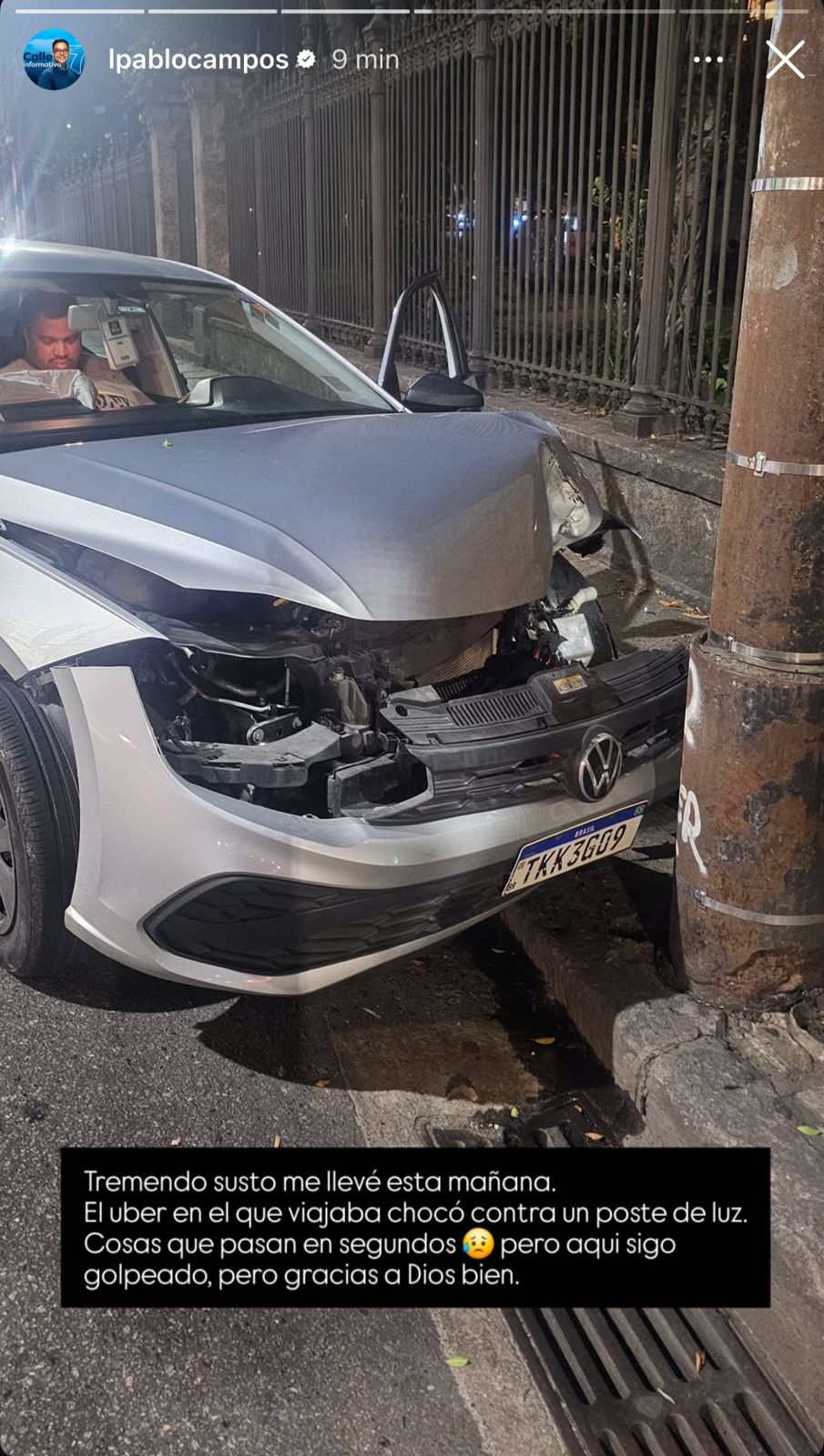 A través de sus historias en redes sociales, el periodista compartió una imagen de un vehículo con la parte delantera destrozada y afirmó que se llevó un gran susto esa mañana, cuando el Uber en el que viajaba chocó contra un poste de luz. Campos aseguró que estaba golpeado, pero fuera de peligro.