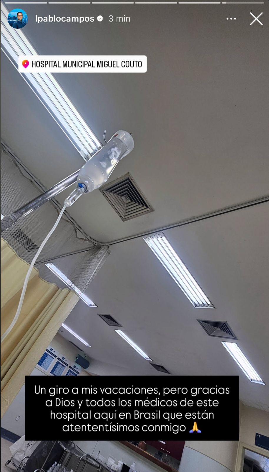 Minutos después, el comunicador informó que se encontraba en el Hospital Municipal Miguel Couto, en Brasil. Además, señaló que sus vacaciones dieron un giro inesperado, pero destacó la rápida atención y el buen trato recibido por parte del personal médico.