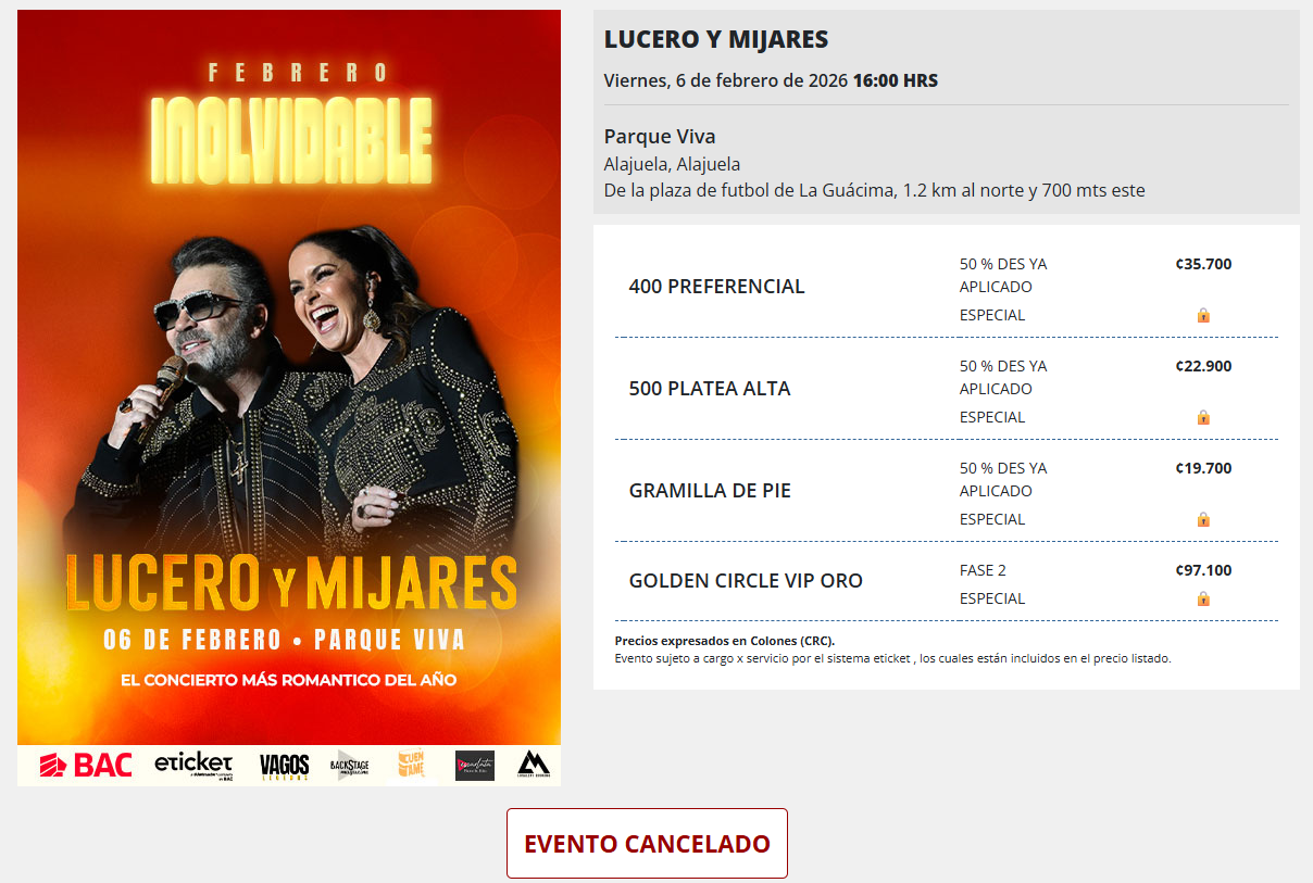 El concierto de Lucero y Mijares en Costa Rica fue cancelado, según así se señala en la plataforma virtual, Eticket.cr, donde se adquirían las entradas.
